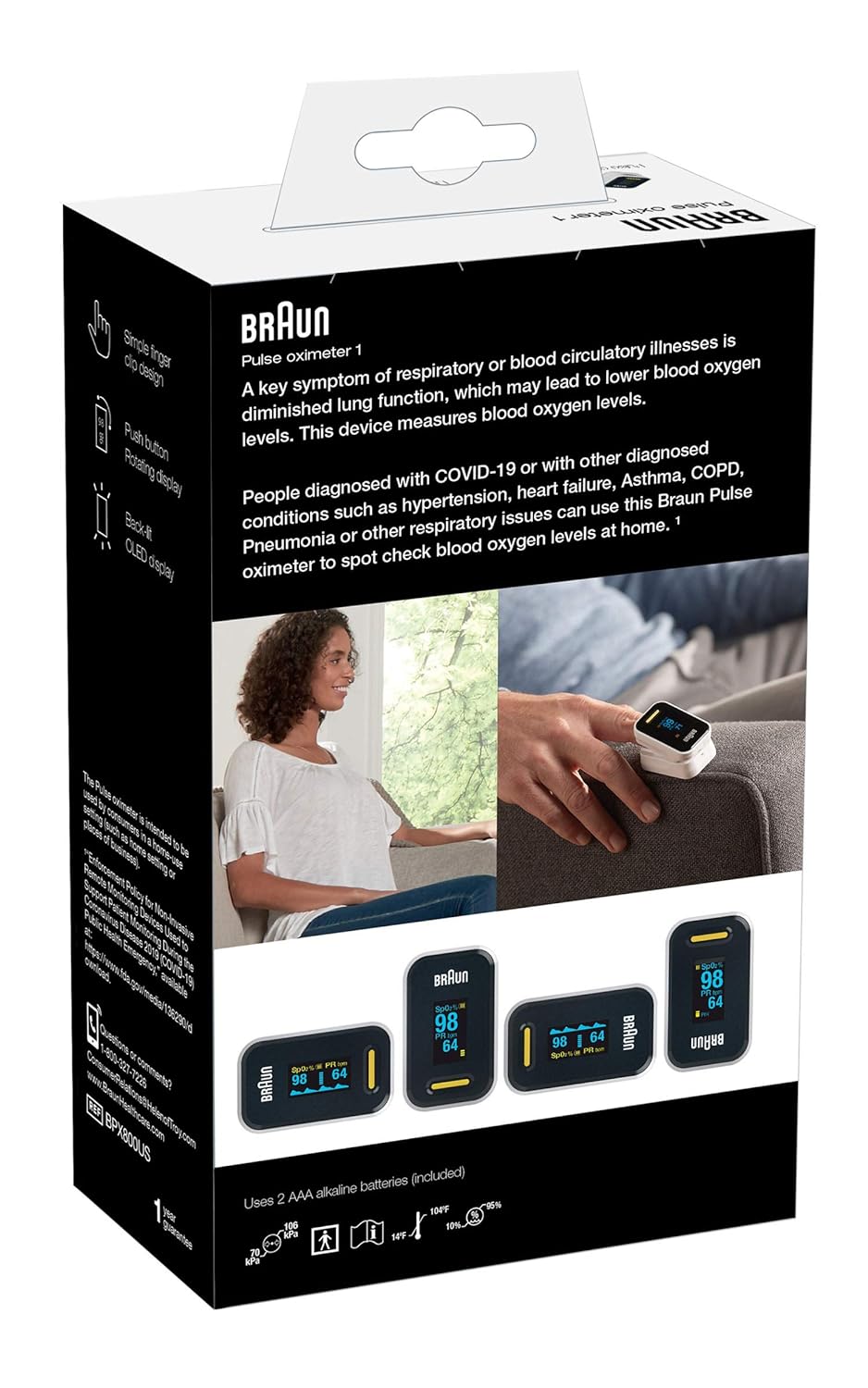 A key symptom of respiratory or blood circulatory illnesses is diminished lung function, which may lead to lower oxygen blood levels. Use the Braun Finger Pulse Oximeter to stay on top of your respiratory health and measure oxygen blood levels. With clinically validated accuracy, you can rest easy knowing the results from this blood pulse oximeter are quick, reliable and accurate, every time. This digital pulse oximeter is easy to use, too, with a simple finger clip design, push button rotating display and backlit OLED display. It can be used for adults and as a pulse oximeter for kids 12 and older. Pediatricians rely on Braun products, including pulse oximeters, ear, forehead and no contact thermometers, and you can, too. Your family’s health is of the utmost importance, and we make products you can trust.