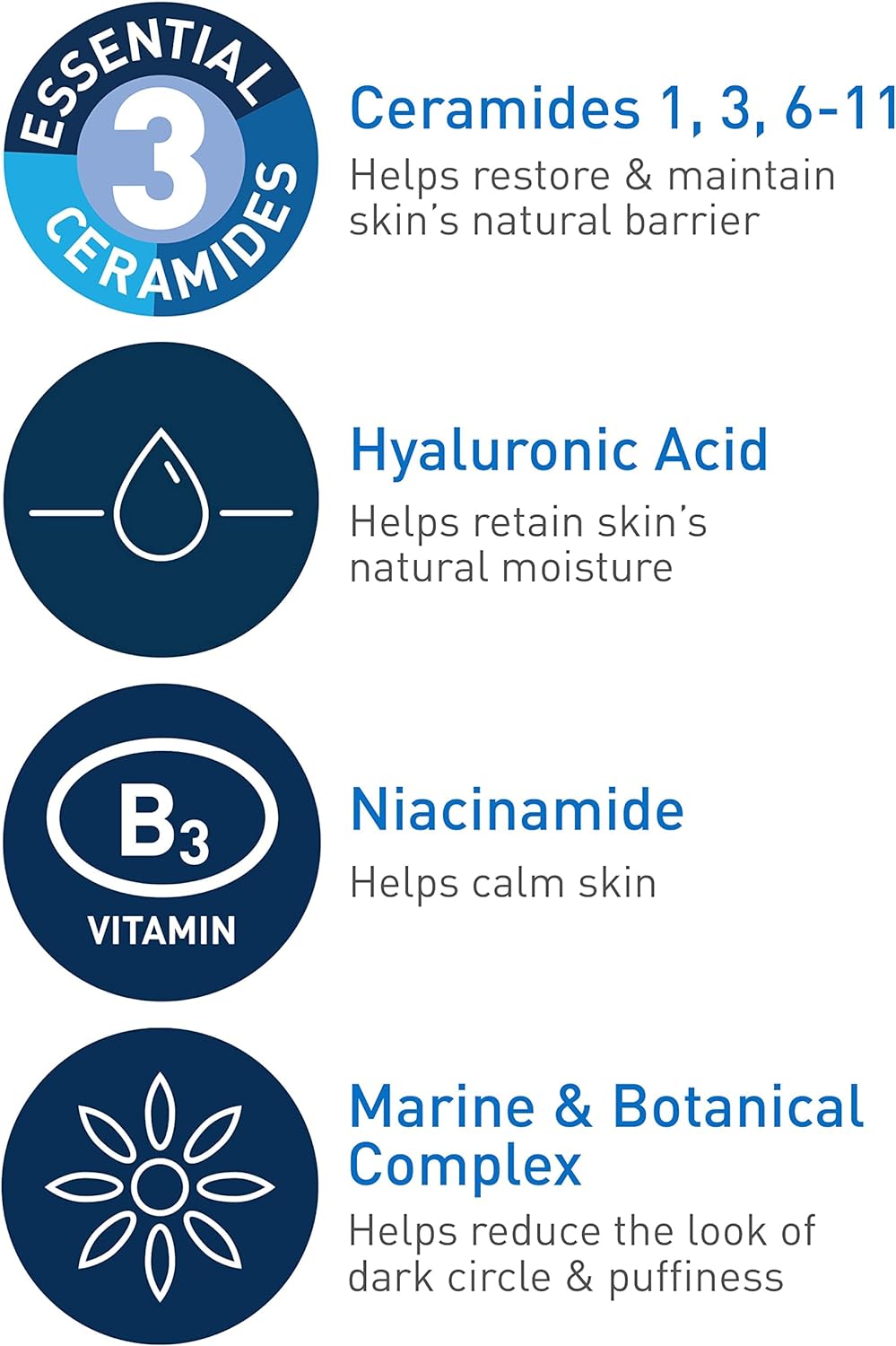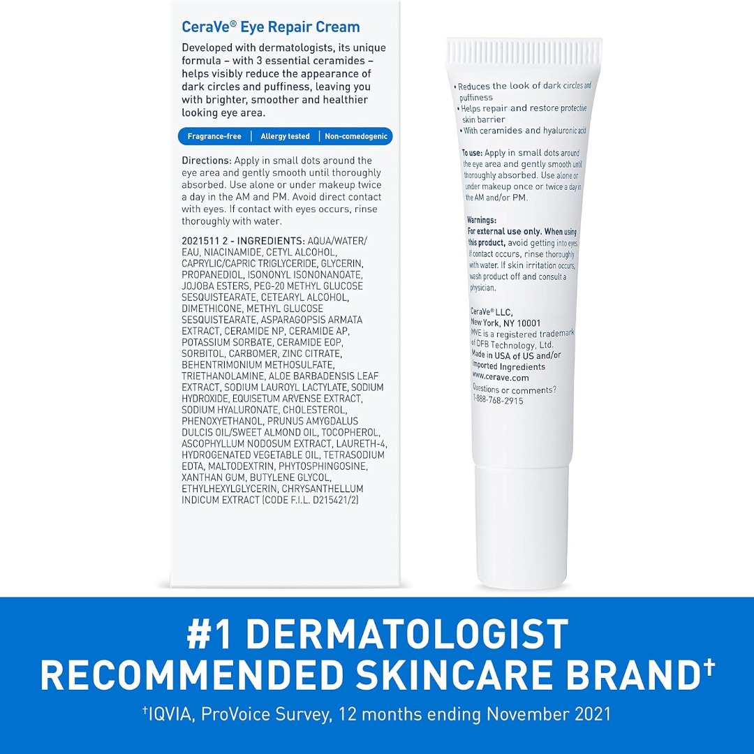 Developed with dermatologists, CeraVe Eye Repair Cream visibly reduces the look of dark circles and puffiness. It contains 3 essential ceramides to repair and restore the protective skin barrier. For optimal results, apply in small dots around the eye area and gently smooth until thoroughly absorbed. Can be used once or twice daily in the AM and/or PM. •Fragrance-free •Non-comedogenic •Ideal for all skin types •Ophthalmologist-tested •Allergy-tested Key Ingredients: •Ceramides: Essential for healthy skin, ceramides help restore and maintain the skin’s natural barrier •Hyaluronic Acid: This ingredient attracts hydration to the skin’s surface and helps the skin retain moisture •Niacinamide: Helps calm the skin •MVE Technology: This patented delivery system continually releases moisturizing ingredients for 24-hour hydration •Marine & Botanical complex: Helps reduce the look of dark circles and puffiness