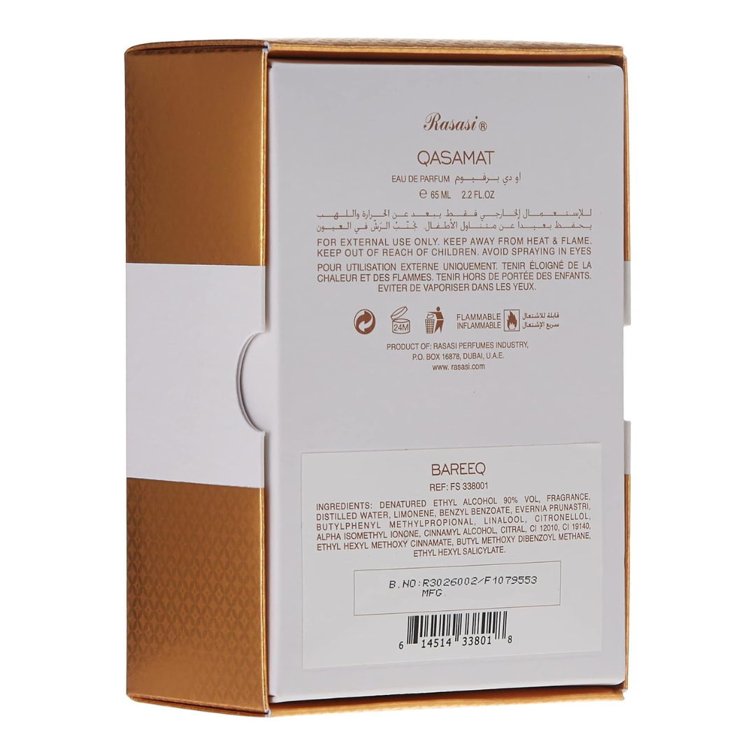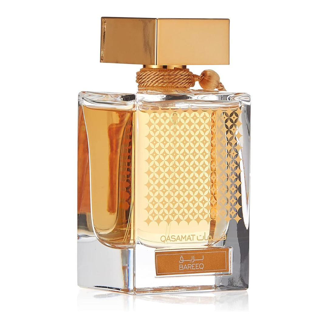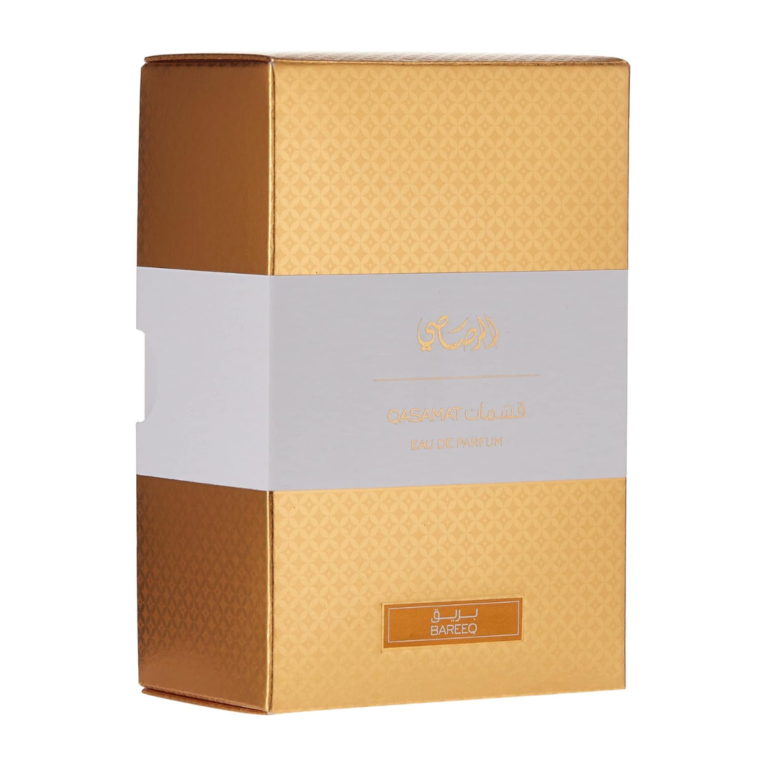 Qasamat – Bareeq, EDP-65ml. Qasamat, is a series of four unisex fragrances inspired by the rich perfumery traditions of the Middle East. The opulence and enigmatic mystique of oriental olfactory finds a contemporary expression in four unique scent journeys which are addictive and accentuated by distinctive features. These perfumes celebrate the love for bling as a language of self-expression in modern times and revel in easy elegance and an irresistibly infectious joie de vivre. The fresh opening notes of bergamot, orange and green apple are overpowered by the sweet notes of caramel and saffron in the heart of the perfume. The jasmine and rose give this perfume an endearing oriental nuance. A powerful base of strong smoky woody notes held together by musk and buttressed by the leather accord, lends this long-lasting perfume an aura of supreme confidence.
